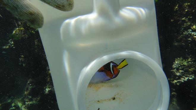 小小丑跟藍倒吊不敢冒然離開水筒...到最後只好用手把它們請出來...