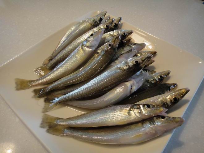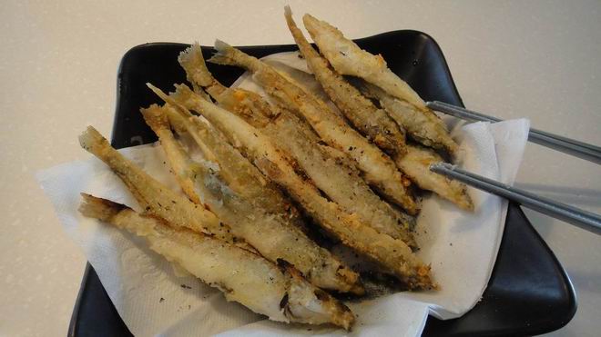 這種酥炸後撒上胡椒的口感就很棒,小寶一次吃掉了6條,叫我下次還要釣回來....