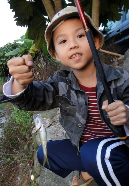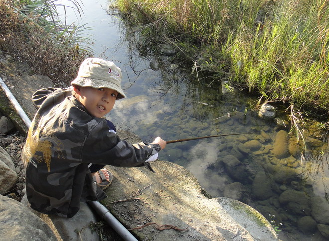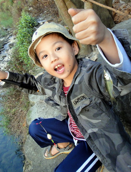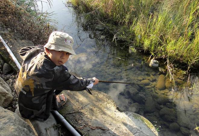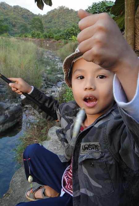 這次我叫他自己操竿子,自己注意浮標,自己拉魚...