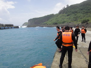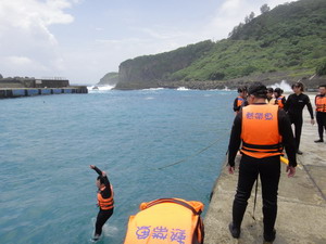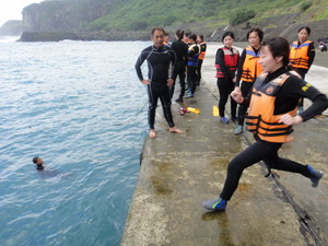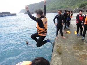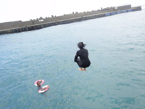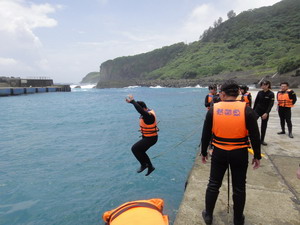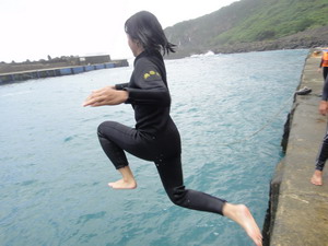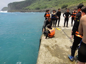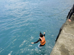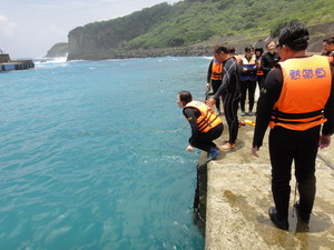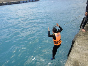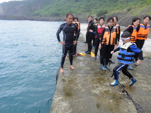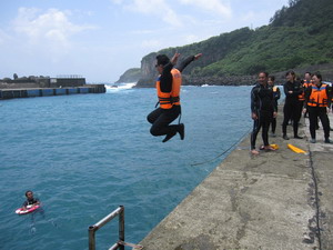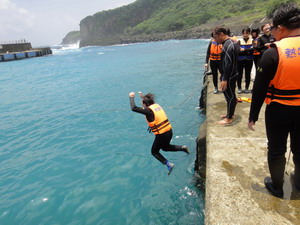 教練前空翻入水,負責水下安全,岸上的另一位教練簡單指導一下,要大家勇敢的往下跳