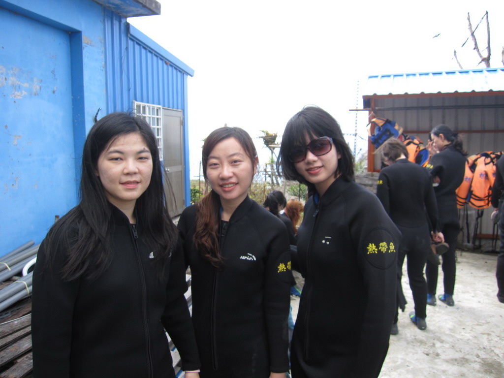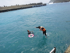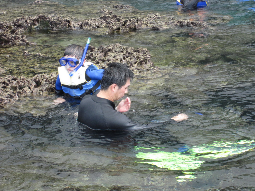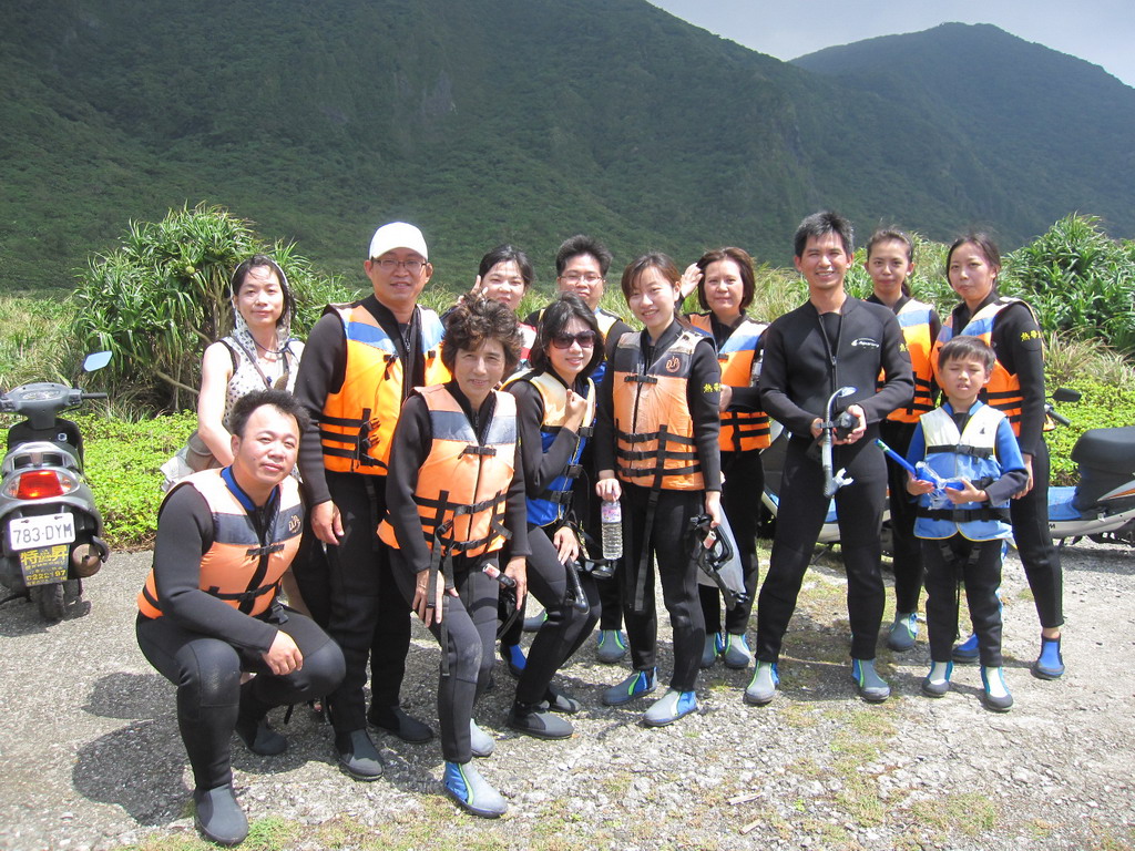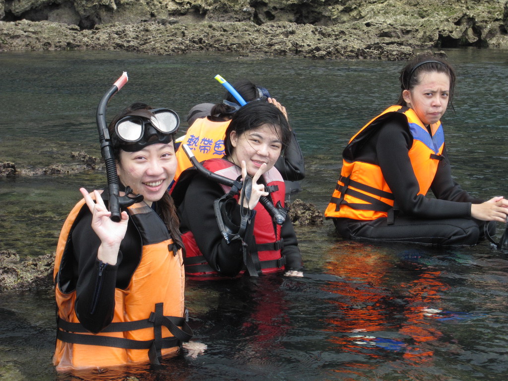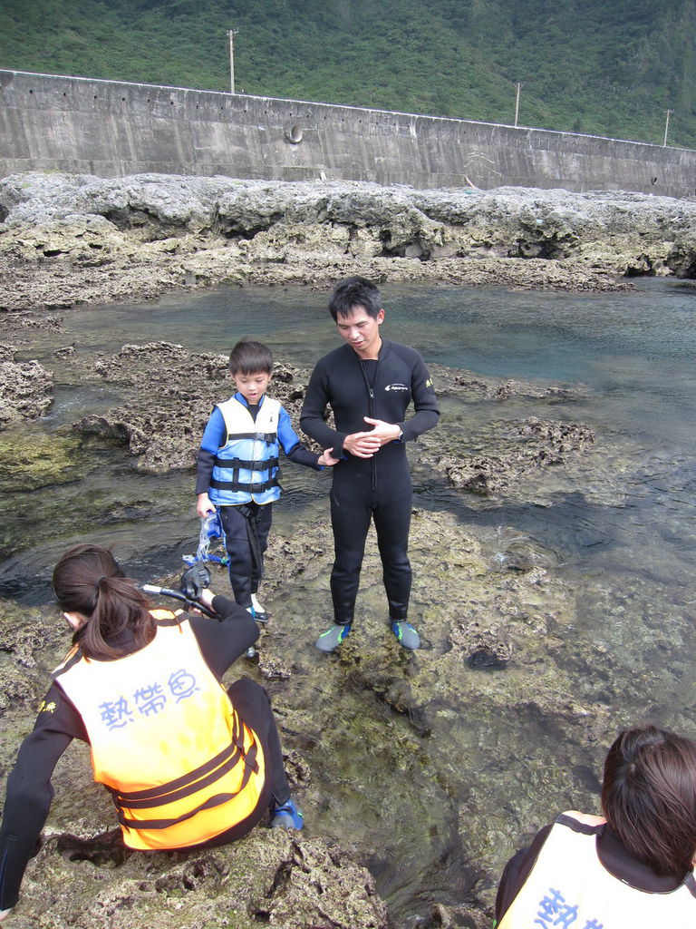 團中有幾位不曾浮潛的朋友,教練將他們一個個慢慢帶下水