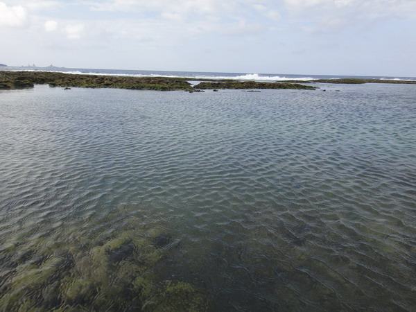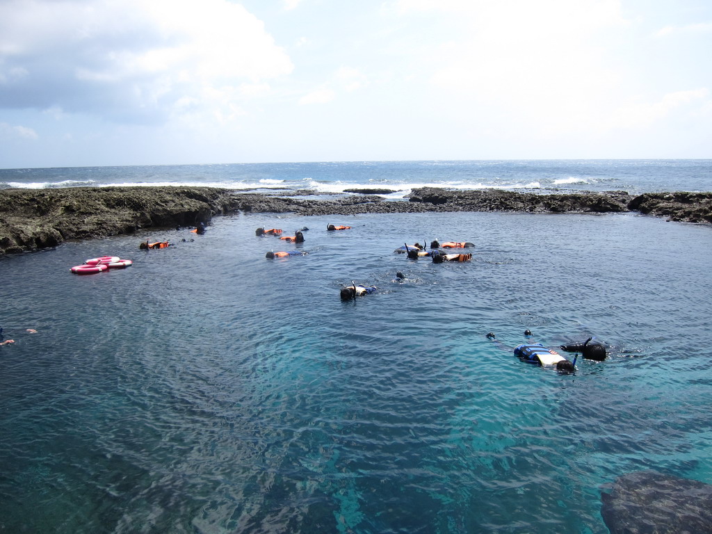 一個約籃球場大的潮池中,有幾個人泡在水中,似乎那就是我們浮潛的地方