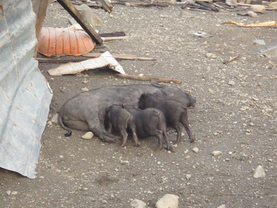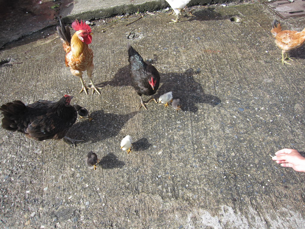 下山後在路口遇到幾隻小豬和一群母雞帶的小雞,