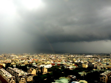 於是衝向頂樓,在雷聲閃光中拍下上面這張彩虹...